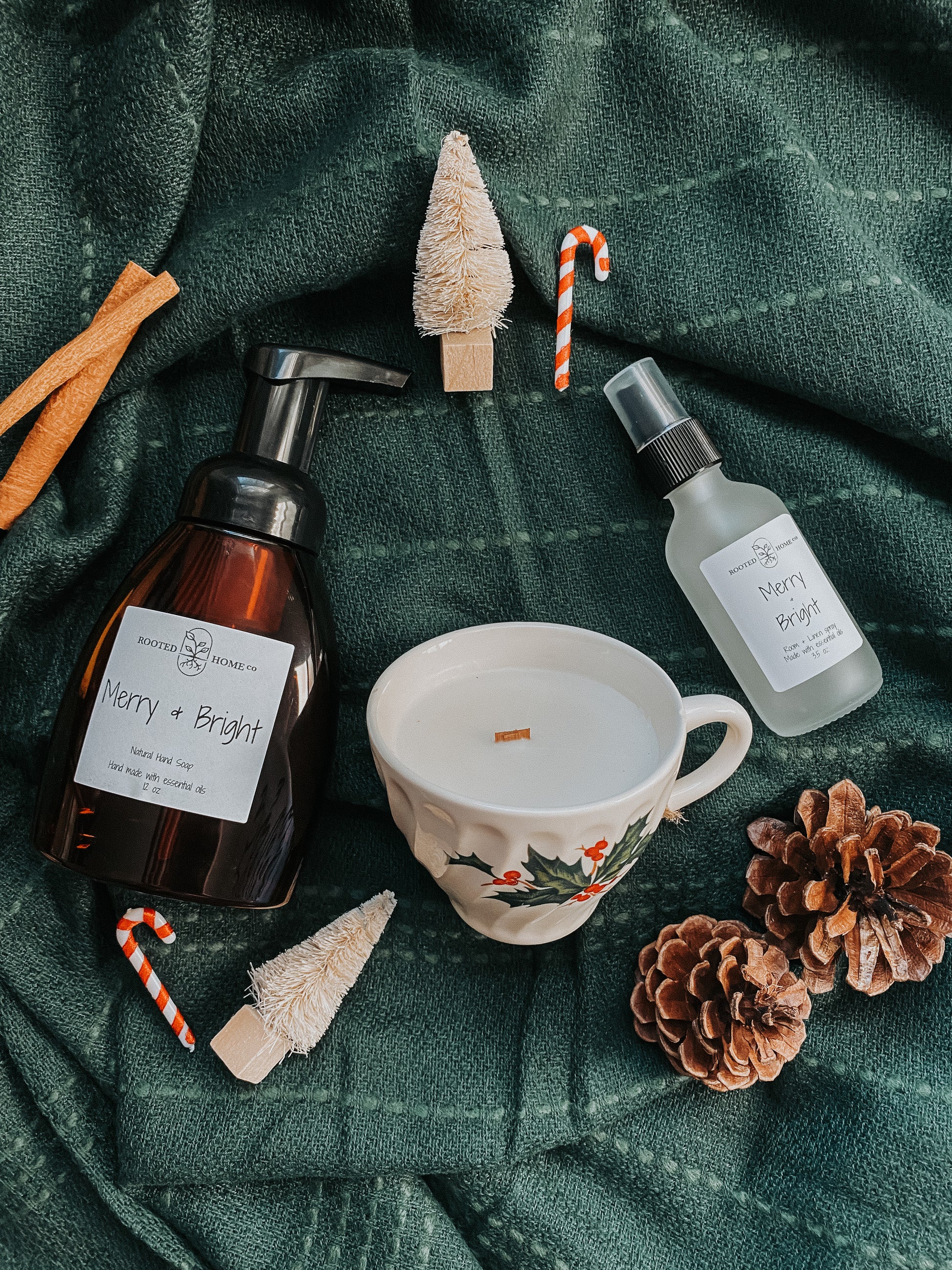 Holiday bundle! Includes: Hand soap + Room/linen spray + wood wick candle in a recycled glass Christmas jar 🎄✨